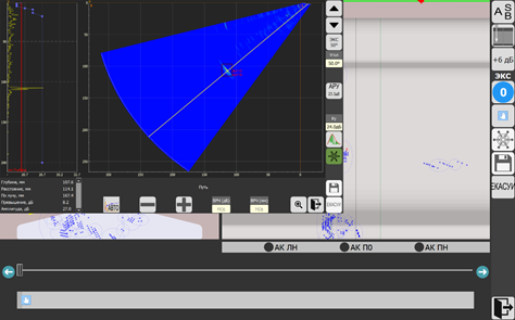 In real time, a B scan can be seen on the flaw detector screen as a rail contour with defect parameters: coordinates, location in the weld section, conventional dimensions, detectability coefficient. Detailed analysis of all signals is available in A and S scans.