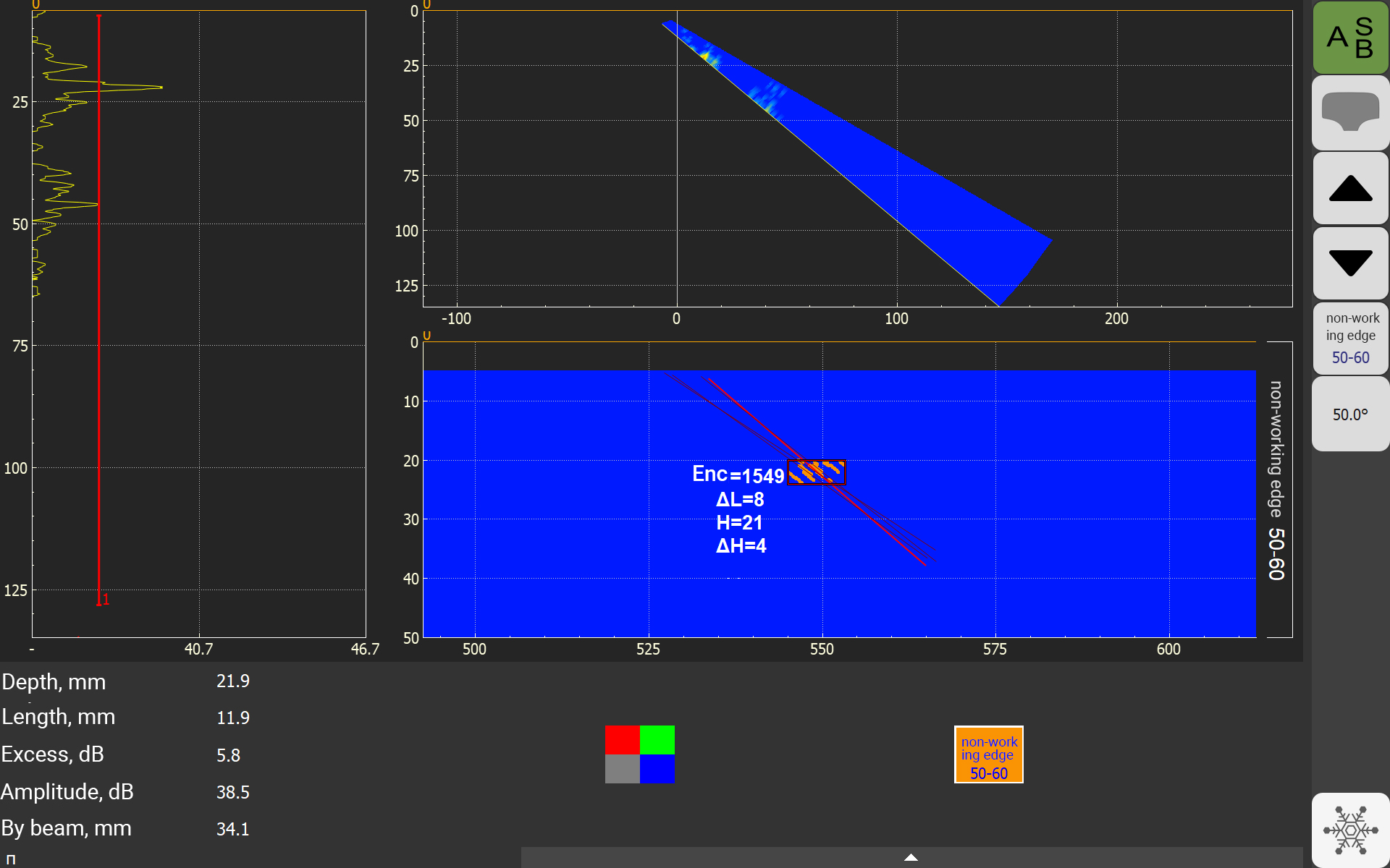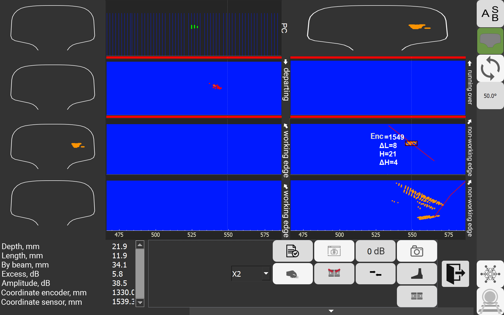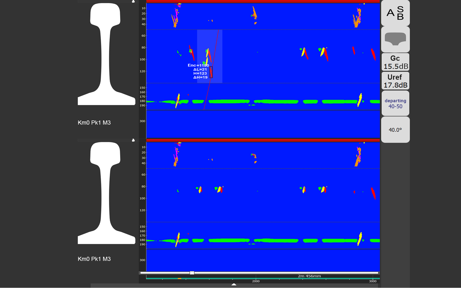 The ultrasonic phased array method (PAUT) and the ultrasonic low-frequency echo-method are used to scan railway tracks (R50, R65, R75 UIC52, UIC60, etc.).